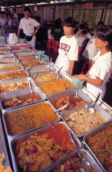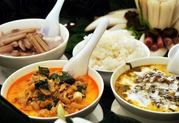 Блюда в меню поделены на 2 группы: обычная еда и spicy. Выбирать второй вариант нужно особо осторожно, ведь еда настолько острая, что ее вкус практически не различается: рыба это, рис, фрукты или овощи. Но тайцы считают, что блюда без специй - пресные и невкусные. Поэтому, здесь так распространены чили, уксус, сахар, рыбный соус, который часто используют вместо соли и так далее. Кроме остроты и обилия пряностей тайская кухня отличается интересным сочетанием вкусов: сладкое и горькое, кислое и сладкое. Один из главных продуктов местной кухни - рис, который бывает двух видов: рассыпчатым и клейким. Приготовленный кхао суай или рассыпчатый рис едят, накалывая его вилкой и перемещая на ложку. Из клейкого риса скатывают маленькие шарики и подносят ко рту руками. Нож в сервировке стола не используется вообще, поскольку все ингредиенты очень мелко нарезаны и берутся либо рукой, либо столовыми приборами. Рис готовят как сам по себе, приправляя, например, лимонником, свежим кориандром и соусами, или используя для блюд: жаркого, кушанья с устричным соусом и различных супов. Второй стратегический продукт - лапша и макароны, которые бывают трех видов: тонкие рисовые, толстые и питательные и третьи - яичные. Из лапши готовят супы и подают на гарнир, например, к маринованным кусочкам курятины, утки или свинины, фрикаделькам или тайским пельменям. Хорошо дополняют лапшу и различные овощи и молодые побеги сои. Тайская кухня очень богата на морепродукты. Достаточно туристу сказать заветное «seafood», как любой таксист отвезет его туда, где жарят, варят и запекают вкуснейшие, по его мнению, креветки, крабы, кальмары и рыбу. А готовят их, например, в множестве придорожных закусочных, где перед входом часто стоят ванны с ледяной водой, в которой плавает всевозможная морская живность. Ей и суждено стать будущим обедом или ужином. Мясо тайцы исплльзуют реже и, в основном, курятину, утку или свинину. А вот традиционных для нас молочных продуктов тайцы не употребляют. Вместо этого, у них в ходу кокосовые молоко и сливки, которые часто используют для при варке и тушении. Например, некоторые супы варятся просто на кокосовом молоке. Кстати, у тайцев есть аналог привычного для нас творога - творог из сои. Соусы - это отдельная тема разговора, они непременный атрибут многих блюд. Настоящими деликатесами считаются разнообразные соусы карри, приготовленные на кокосовом молоке. Овощи - очень важный элемент тайской кухни. Часто применяются помидоры, сладкий перец, ростки сои и соевые бобы, восточно-азиатский вид шпината, лук, огурцы, китайская капуста, плоды хлебного дерева, водяные каштаны и плоды, которые напоминают одновременно и фрукт, и овощ. Например, канун или як, который используются как для десерта, так и для основного блюда - в зависимости от того, насколько он дозрел. Таиланд - настоящий рай для фруктового гурмана. Фрукты здесь просто в изобилии и едятся как сырыми, так и в виде всевозможных десертов. Например это: Драконов фрукт - это вытянутый фрукт интенсивно-розового цвета с крупной чешуей, зеленой по краям. Мякоть белая, с множеством черных зернышек, вкусом напоминающая киви. Манго - овальный плод с желтой, зеленой кожурой, часто с красноватым оттенком. Ароматную сладкую мякоть тайцы едят с приправами и сахаром, добавляют в салаты. Гуава с виду похожа на яблоко, с тверды