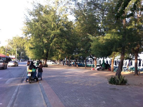 Вот так выглядит сама набережная, простая тайская улочка, где у моря виднеются лежаки и зонтики.