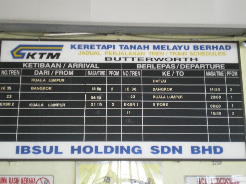 Как добраться из Куала - Лумпура до Бангкока наземным транспортом.Вечером перед отъездом из Малайзии мы перерыли весь интернет, и буквально по крупицам собирали информацию, о том как же добраться из Куала- Лумпура в родной Хуа - Хин. Перелопатив кучу сайтов, все что мы узнали что прямой экспресс из столицы Малайзии в столицу Таиландка действительно существует. Называется Восточный экспресс, с пианино в вагоне ресторане и шикарными купе. Стоит это удовольствие 1500$. Для более экономных людей, все оказалось несколько сложнее. Ехать нужно с пересадкой в приморском городе Малайзии, который называется Батерворф. В этом месте осуществляется посадка на поезд до Бангкока с с отановкой в Хуа -Хине и других крупных городах Таиланда. А так же идет поезд, автобус и паром на остров Пенанг ( Малайзия ). До Батерворфа мы решили доехать на автобусе.Рано утром мы собрали вещи и понеслись на автовокзал, куда на привез автобус из аэропорта. Побегав и расспросив водителей и таксистов, мы поняли, что это парк городских автобусов, а междугородние автобусы отходят совершенно с другого автовокзала, где то на другой стороне города. Ловим такси (300 рублей), нервничаем, до отхода нашего автобуса в Батерворф 25 минут. Разговорчивый таксист, решил нам судя по всему устроить экскурсию, провозя мимо дворца султана. Но привез куда нужно, сдал лично водителю автобуса, тот не выпускал нас из виду, пока мы не сели в автобус. Автобус оказался выше всяких похвал. Удобные анатомические сидения, ноги можно вытянуть во всю длину, кондиционер, туалет, даже телевизоры, встроенные в ручки кресел (правда оказались не подключенными). По дороге мы проехали перевал через горы. Тропические леса, на макушках гор, утопали в облаках. Горные массивы величаво возвышались вдали. Духозахватывающее зрелище! Поездка оказалась несколько длиннее чем предполагалась, около 5 часов. Думали опадаем на поезд, но прибежав на вокзал, мы с удивлением обнаружили, что поезд будет через 1,5 часа, хотя расписание смотрели в интернете. Поезд идет один раз в сутки в 14:20 по местному времени, стоимость билета до Бангкока около 1000 рублей на человека. До Хуа -Хина на двоих вышло 1900 рублей. Автовокзал и железнодорожный вокзал оказались расположены совсем близко, такси нам не понадобилось. Батерворф оказался небольшим, захолустным и очень спокойным городком, с главной достопримечательностью - железной дорогой. Вот так выглядите здание вокзала. А это расписание. В оставшееся до поезда врем мы успели перекусить рисом с мясом за 40 рублей за каждого. И прикупить сладенького в дорогу. Маринованные фрукты. Своеобразный вкус! В зале ожидания европейцев было не много, в основном малайцы и иже с ними. Хотя встретилась нам странная личность, европейского вида в дредах, босиком и котомкой через плечо. Поезд оказался совсем небольшим,всего 3 вагона все 2ого класса. Внутреннее убранство поезда было а-ля наш плацкарт, только более усовершенствованный. Внизу широкие сидения, сверху полки с чистым бельем, матрасами и махровыми одеяльцами. Мне, как бывшему проводнику, не хватало шума детей, чая в подстаканниках, запаха копченой курицы и пьяных песен пассажиров. Все было чинно и пристойно. В окне мелькали рисовые поля в вперемешку с затопленными деревушками. Никаких боевых действий на юге, которыми пугают туристов не наблюдалось. По дор
