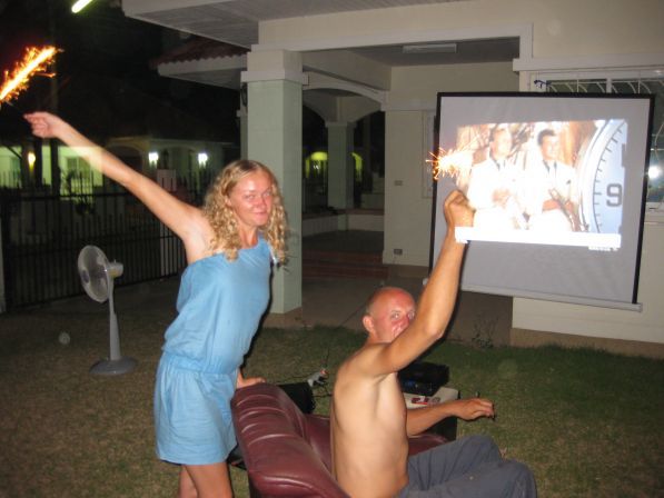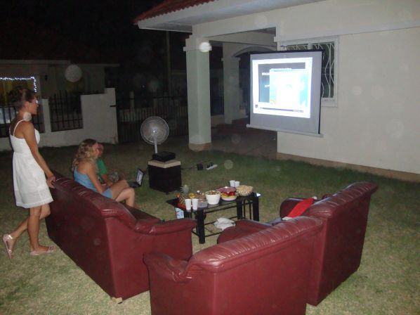 Выставили кожаный диван и кресла на газончик, в загородном доме наших друзей, и настроили проектор, что бы посмотреть бой курантов и "С легким паром".(Ролик с обращением президента скачали заранее)))).
