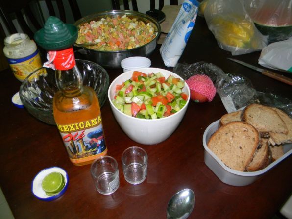 Затем собрались с друзьями и стали готовить любимые сердцу оливье, селедку под шубой, фаршированные яйца. Для того что бы приготовление не было таким утомительным, хлопнули по рюмашке мексиканской текилки. Спросите зачем? Когда столько тайских и европейских ресторанов? Отвечу: после 3 месяцев в Тае, очень хочется родной русской еды, благодаря нашим знакомым мы даже на Новый Год получили черный хлеб,водку и икру! В Таиланде, к сожалению сих продуктов просто нет!(