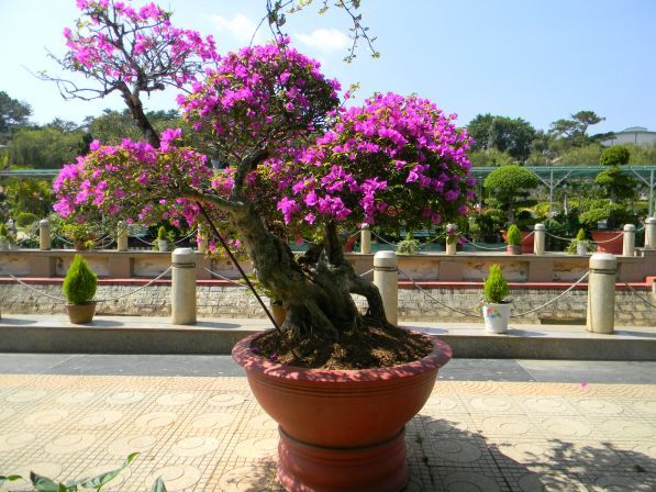 Начну с потрясающего бонсая в рост с человека. Этот кустарник называется бугенвиллия. Назван в честь французского мореплавателя Л Бугенвиля, который в 1768 году совершил экспедицию в поисках новых земель для Франции. Его сопровождал пожилой ботаник Ф Коммерсон, который тогда и переправил в Европу из Южной Бразилии 12 видов бугенвиллии. Особенно популярными стали два из них голая и замечательная. Хорошо поддается обрезке, и формированию кроны, поэтому очень популярен для выращивания бонсай.