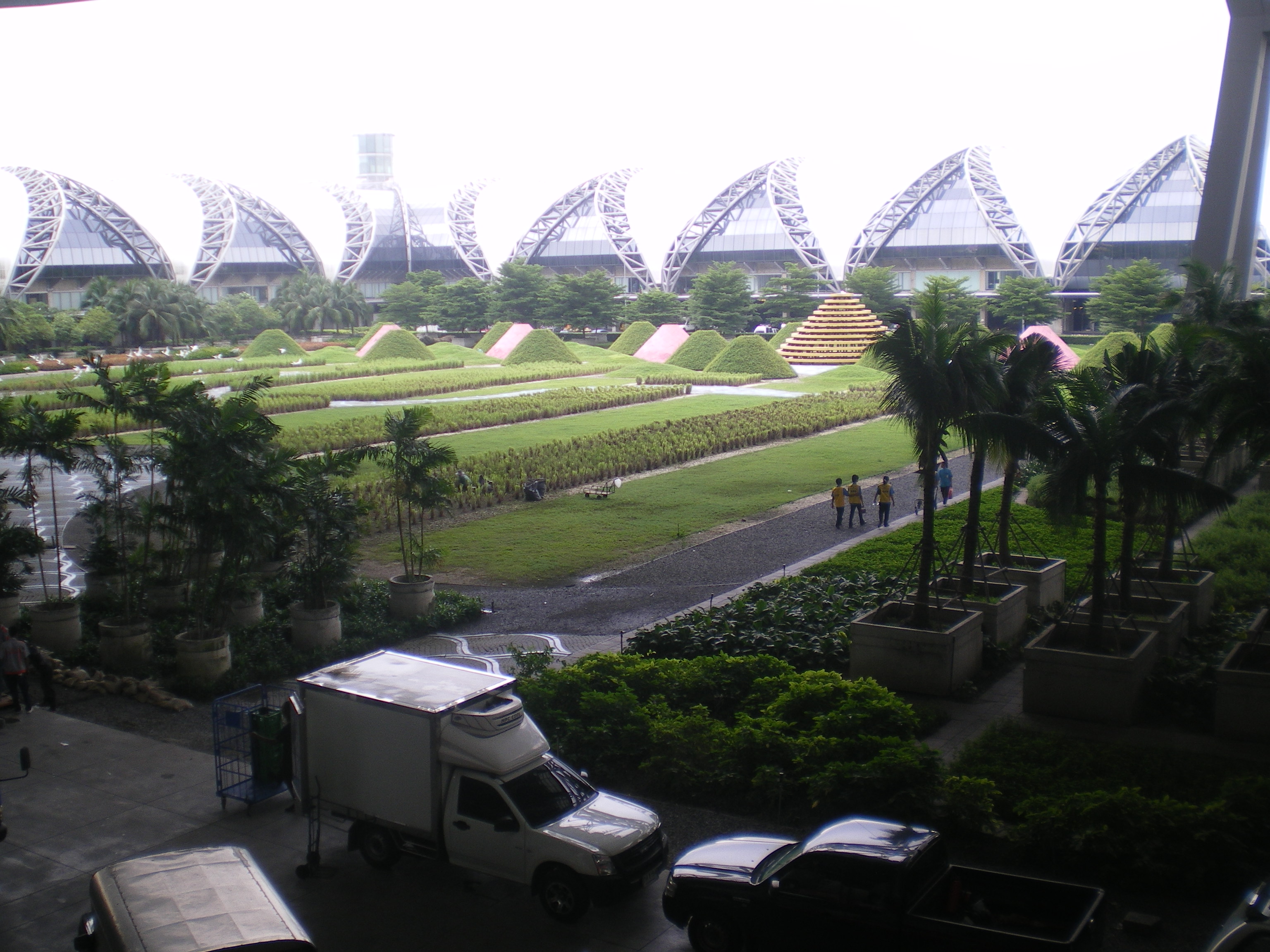 Предыстория.Все началось тогда, когда я познакомились с мужчиной моей мечты (зовут его Павел). После двухнедельного знакомства, Павел вскользь упомянул, что на зимовку он собирается уехать в Тайланд, и спросил поеду ли я с ним." Конечно, милый! С тобой хоть на край света!" - сказала я. Любимый очень удивился, но остался доволен моим ответом. На тот момент мы еще не жили вместе, у меня была своя работа и свои заботы. "Я подумаю об этом завтра." - отмахнулась я от сей мысли, как моя любимая героиня Скарлет Охара из "Унесенные ветром". Но Павел оказался не просто мужчиной, который только говорит, но и делает. Мы стали вместе жить, я уволилась с работы, и мы стали готовиться к поездке в Тайланд. Списавшись с ребятами, которые тоже собирались в "страну улыбок" мы решили остановиться на городе Хуа- Хине. Хуа-Хин - королевская резиденция, потрясающей природой и белыми пляжами, читаем на форуме Винского. Отлично, то что нам нужно, решили мы и стали готовится к путешествию. Купили билеты в Тайланд и Куала -Лумпур (Малайзия), так как без обратного билета нас бы не посадили в самолет. Из под кровати, вытащили запыливший чемодан, который давно уже не видел свет. Составили список необходимых вещей в дорогу, в число которых входила соковыжималка и металлоискатель. До отлета оставалась неделя, началась официальная паника.......Глава 1. Перелет в Тайланд.8 октября 2010г 6:00 утра.Наш путь начался от порога дома в Твери. Мы успешно доехали до аэропорта в Москве, практически без пробок, что не могло не радовать. В Домодедово мы без проблем прошли паспортный контроль, и в мой девственно чистый паспорт поставили первый штамп. Я выезжала за границу впервые. Мы летели в Бангког с пересадкой в Каире, поэтому в самолете было много русских. Летели мы в Египет каирскими авиалиниями. Через 4 часа мы были уже в Каире. Полупустой аэропорт, женщины в паранже и платках, арабы в тюрбанах. Поскольку европейцев не было, на нас таращились практически все, было не ловко. Мы зашли в smoking room, что бы выкурить по сигарете, тогда глаза у арабов стали, как у ботаника, который увидел в своем сачке птеродактиля. В мусульманских женщинам запрещено курить. В вылетела оттуда пулей, с неприятным ощущением, как будто побывала в мужском туалете. Снова паспортный контроль, проверка вещей, ожидание посадки. Прибежали китайцы, болтливые, шумные, с огромными сумками и чемоданами. Оказалось, что самолет после остановке в Бангкоке, направляется в Китай. Перелет был утомительный 11 часов. За это время мы успели покушать, поспать, поругаться, помириться, обсудить людей летевших в самолете, снова поспать, затекли все конечности и жутко болела спина. Наконец, то шасси самолета коснулись тайской земли! Ура мы в Тайланде! Было 14:00 по местному времени. Разница во времени с Россией 4 часа. Аэропорт в Бангкоке один из самых больших в Азии (3 этажа и подземка), поэтому выход нашли не сразу. На выходе нас обдало жаром, ощущение такое, что ты в сауне. Поскольку приехали в джинсах и майка, побежали обратно переодеваться в аэропорт. А вот вид из аэропорта на парк, который в нем и находится. Наши "полетные мучения закончились", мы прибыли в Бангкок. Проездом в Бангкоке.Из аэропорта в сам Бангкок поехали на симпатичном ярко- розовом такси. Стоимость такси составило 400 бат (рублей), которые мы заранее поменяли в аэропорту в обменнике. Кстати курс пр
