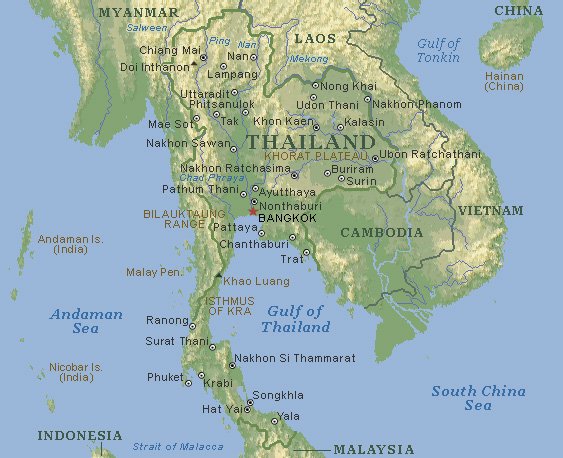 Занимая середину Индокитайского полуострова и северные территории Малакки, Таиланд соседствует с Бирмой по северной и западной границе, Лаосом по северо-восточной, Камбоджа и Малайзия, являются южными соседями королевства. По своей площади, территория страны приблизительно равна территории нынешней Франции и составляет 517 километров квадратных.