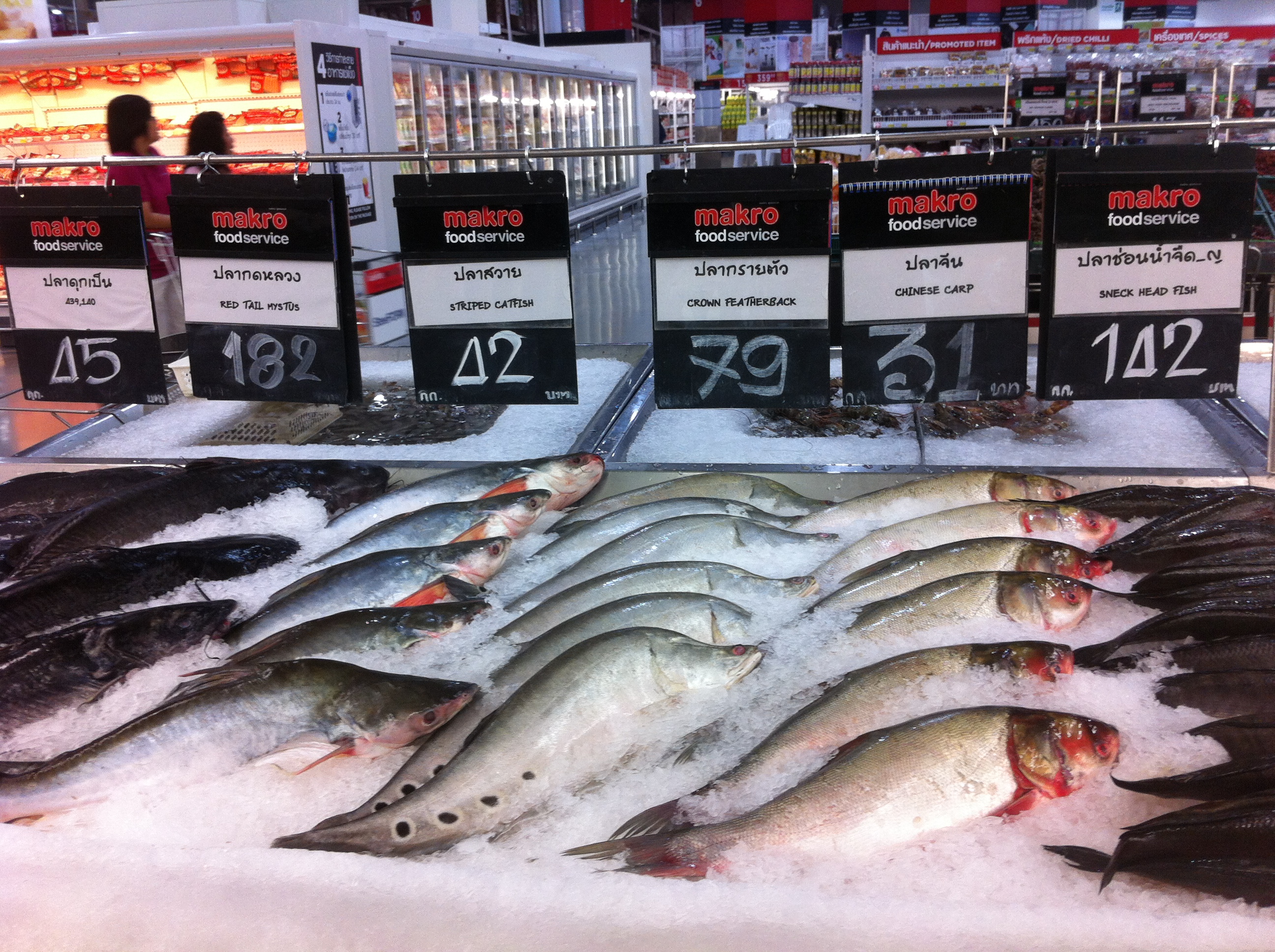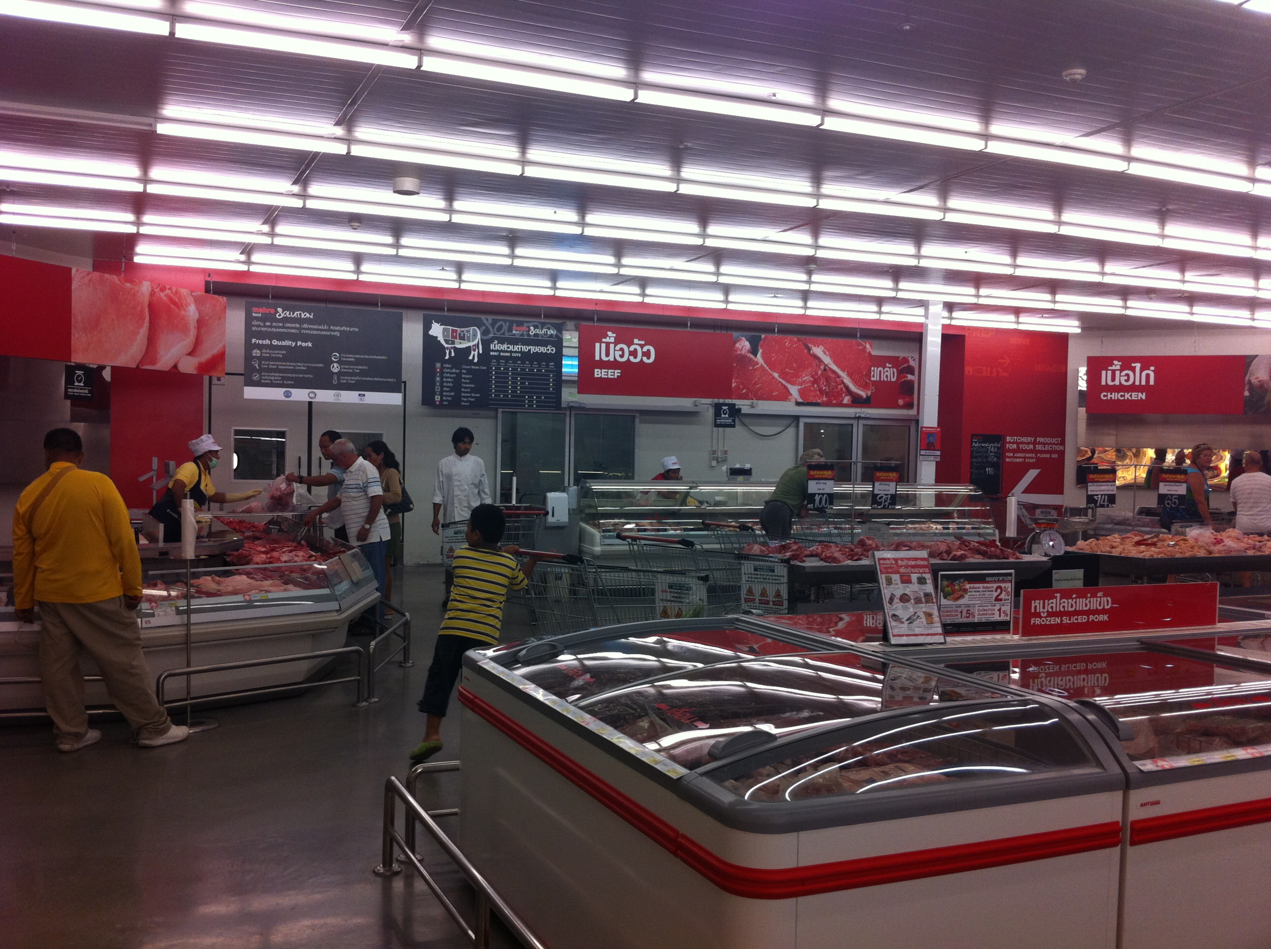 В Макро я нашла говядину, по абсолютно нормальной цене, а не как в европейском магазине 600 бат/кг. Довольно увесистый кусок стоит 110 бат. Свинины и курицы в изобилии, так как ни религия, не всякие вегетарианские ухищрения не запрещают употреблять тайцам мясо.