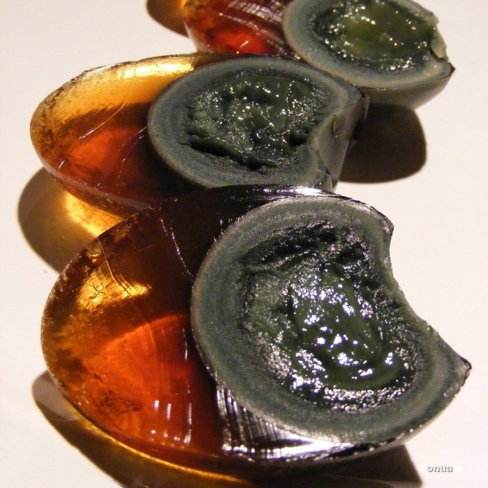 Чем же обыкновенные яйца снискали такую славу и звание деликатеса? Дело в том, что внешний вид этого блюда обескураживает, а иногда даже вызывает отвращение, ведь яйца черные! Точнее белок темно коричневый, а желток серовато - зеленоватый. Запах у этого блюда достаточно специфический, но это не мешает туристам считать сунхуа, отличной пивной закуской. У иностранцев существуют несколько названий этого блюда: императорские (так как сунхуа были одним из блюд украшавших императорский стол), стодневные (по выдержанности), или тухлые (из-за внешнего вида).