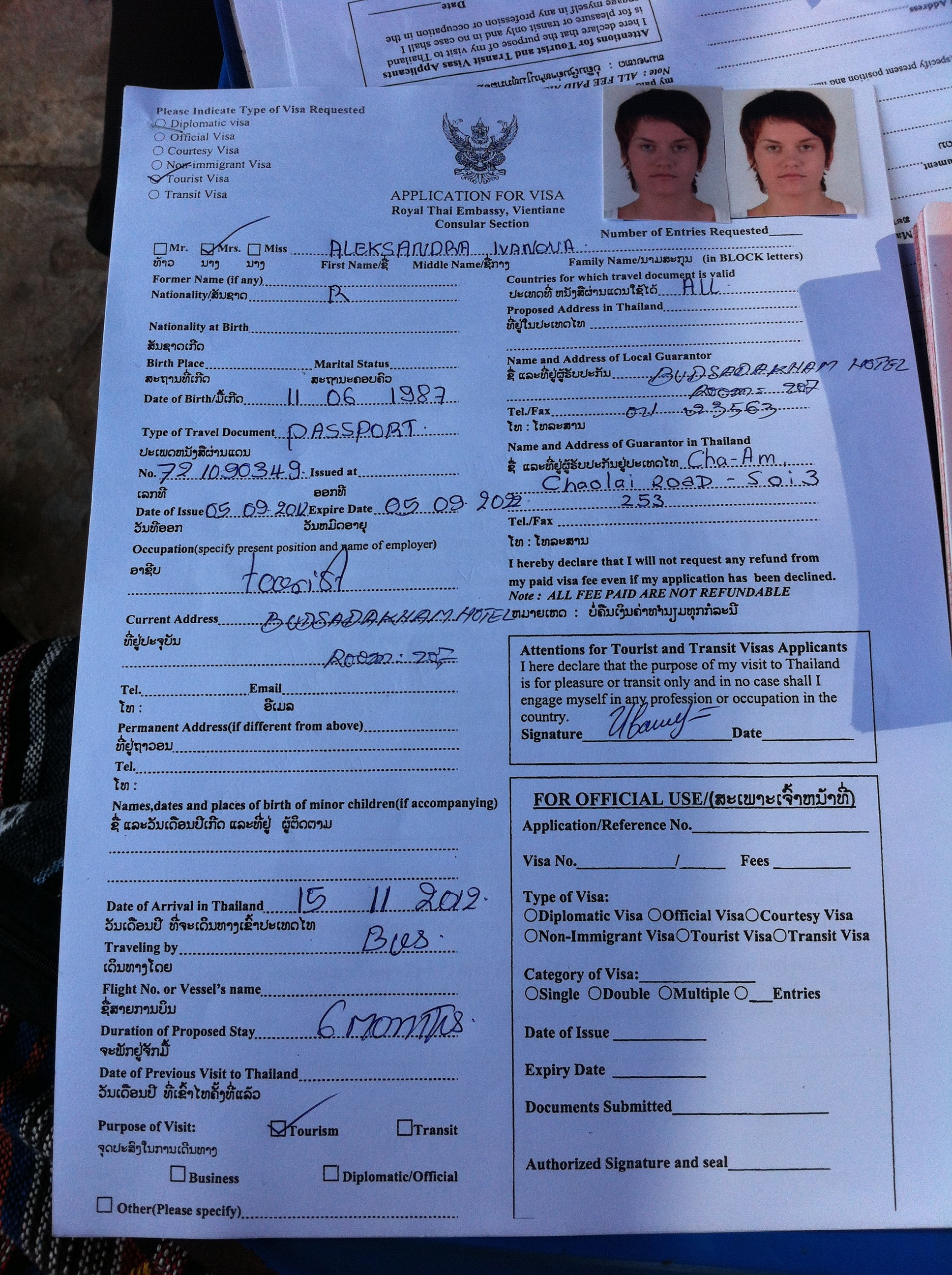 Заполнение заявления вызывает некоторые трудности, поэтому мы воспользовались услугами "помогалы", дежурившего у тайского посольства. За 100 бат нам его заполнили и сделали недостающие копии паспортов, со штампом, которых у нас не было. Очень важно знать свой адрес проживания в Таиланде, а так же адрес какого -нибудь отеля во Вьентьяне (в котором вы предположительно должны были остановиться).