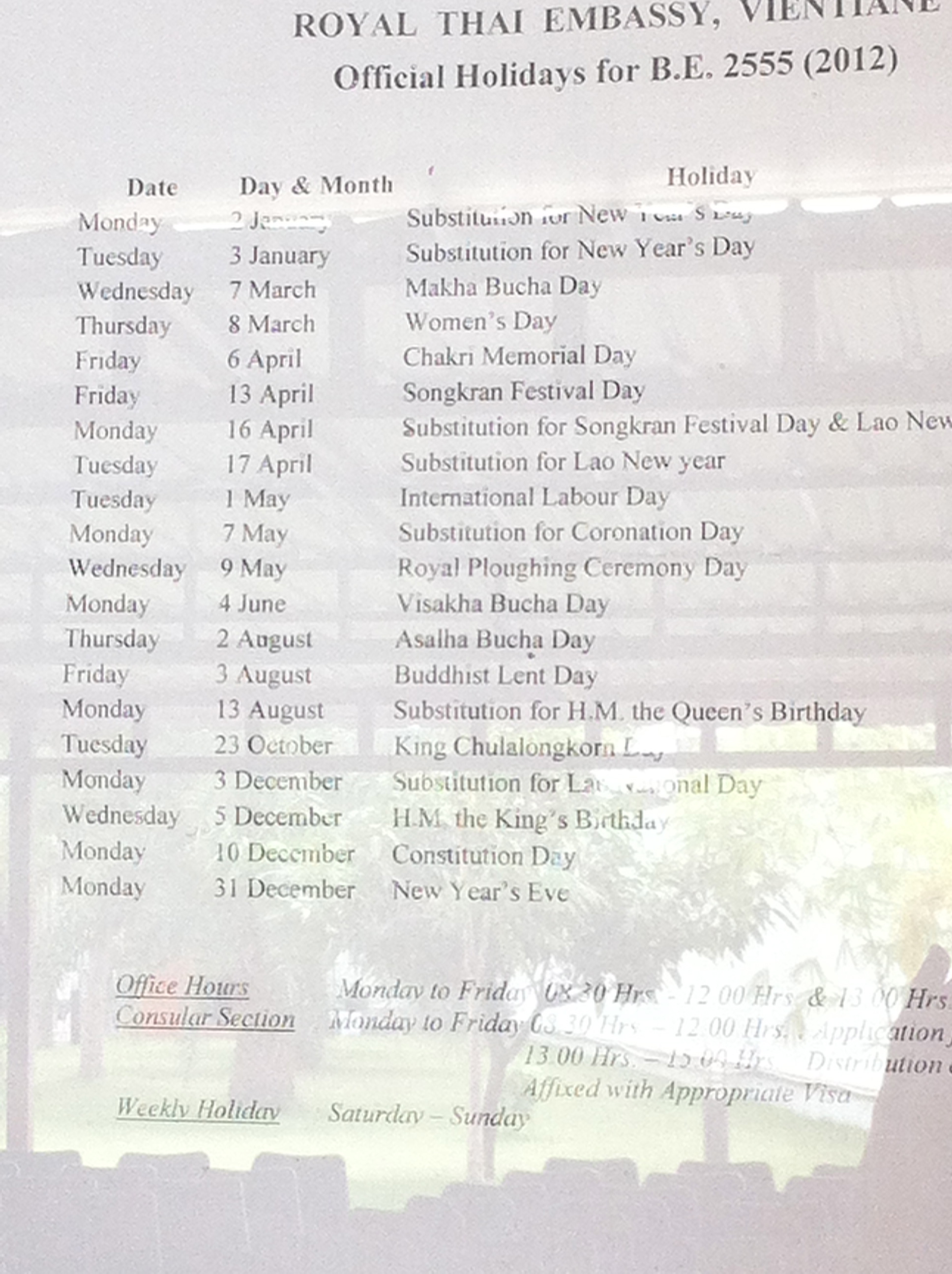 Список праздников и нерабочих дней в консульстве Таиланда на 2012 год.