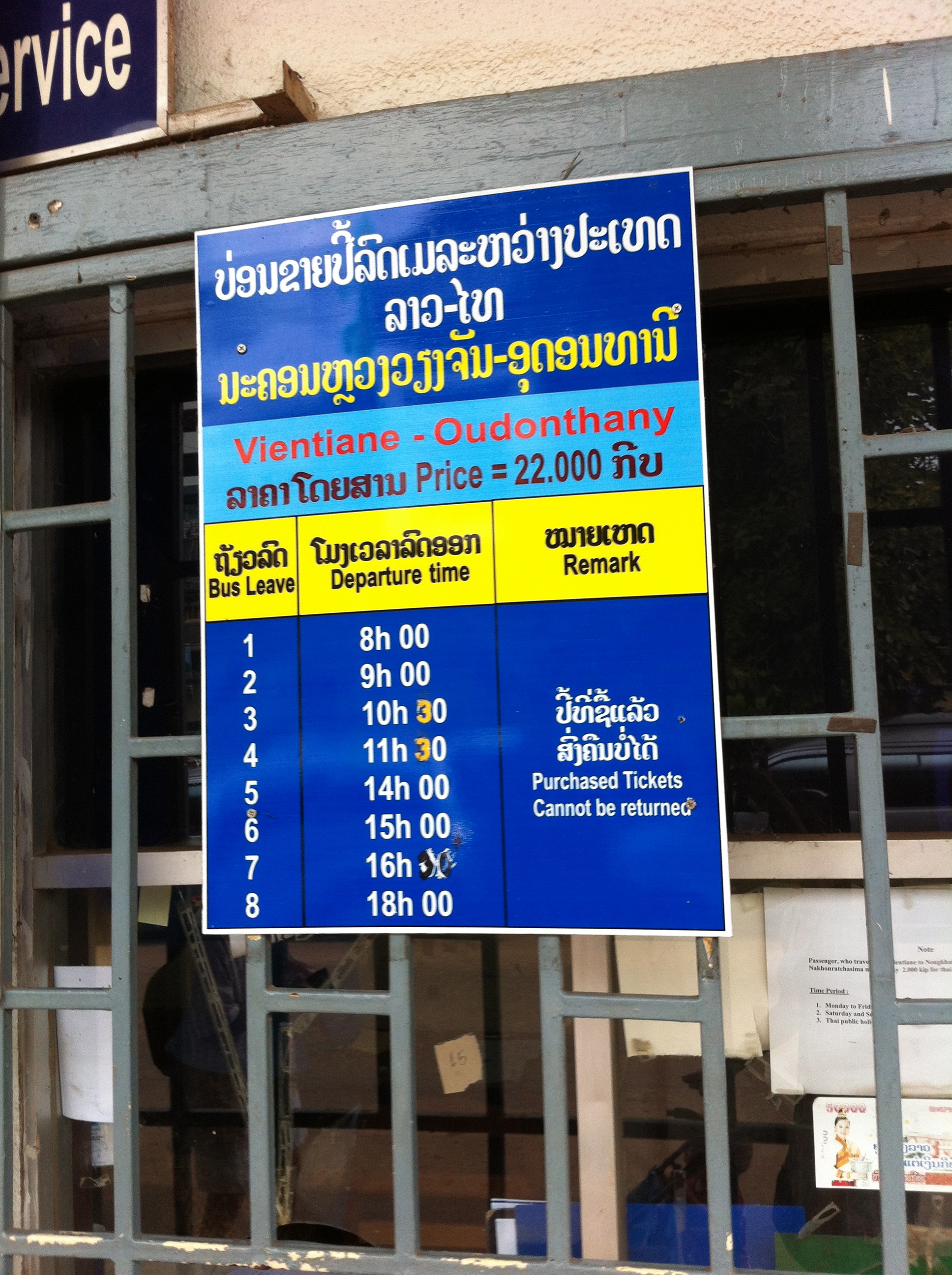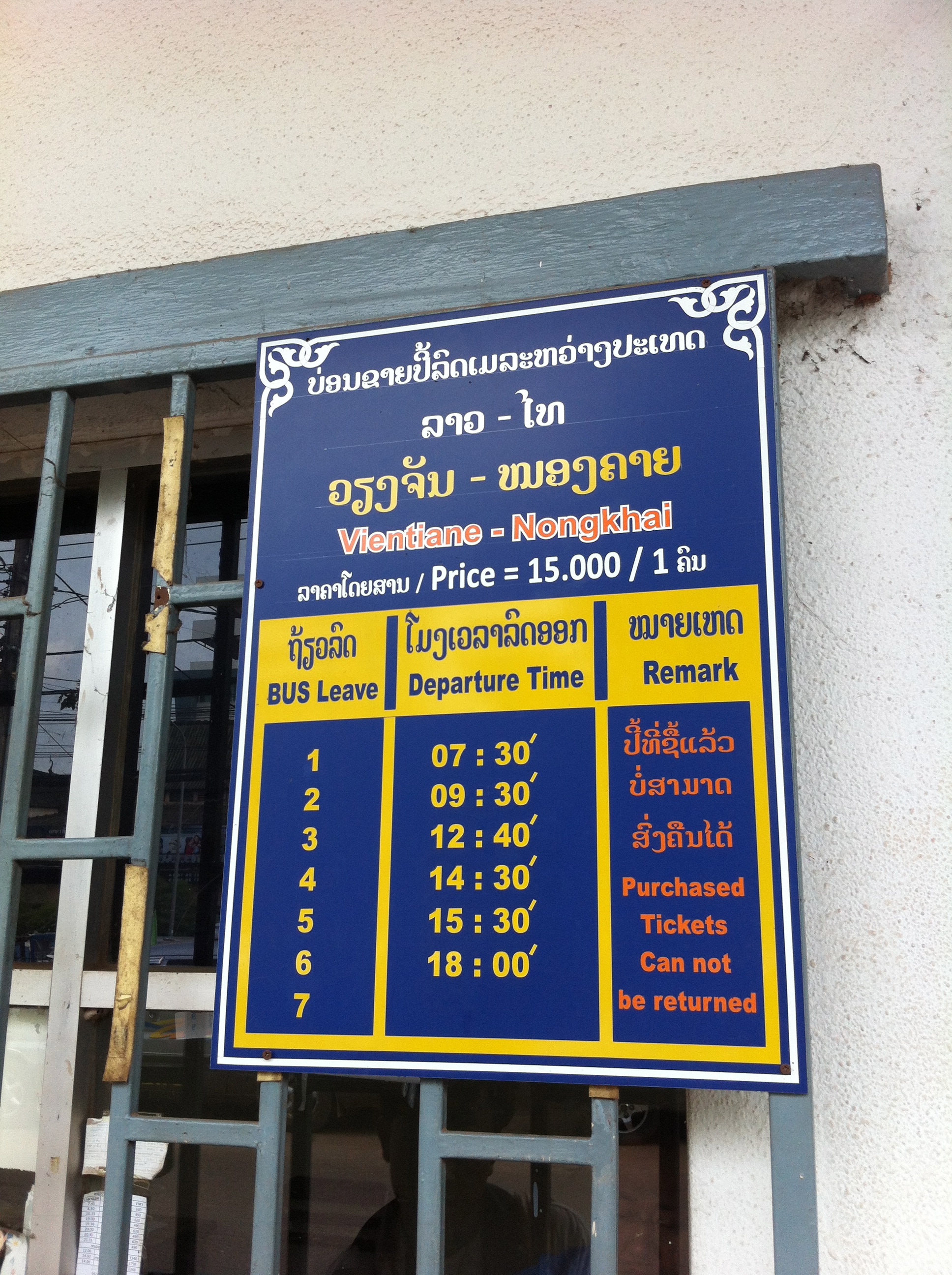 Приезжаете на северный автовокзал, проходите три платформы, и выходите к основному зданию. На третьем этаже продаются билеты Бангкок - Вьентьян. Они идут прямо до столицы Лаоса, с высадками на таможне: тайской и лаосской, где вам ставят штамп о прибытии. На границе не стоит мешкаться, автобус вас долго ждать не будет.